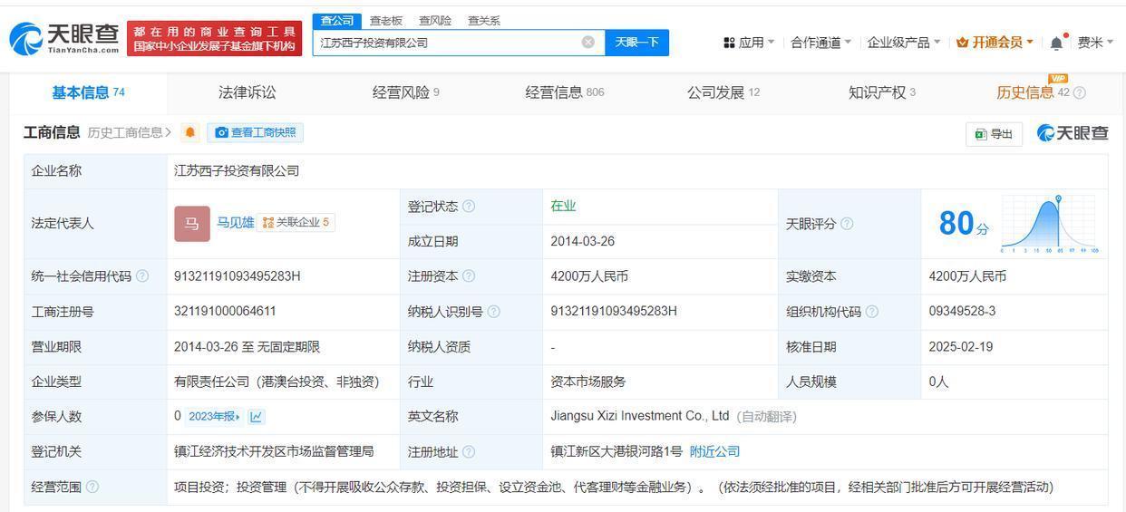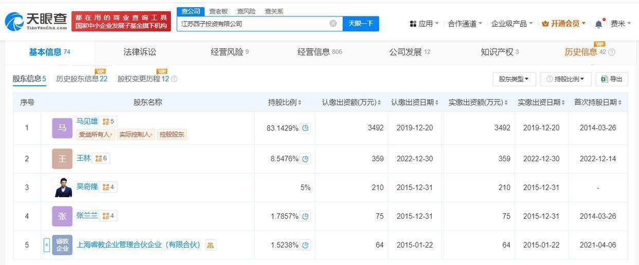 天眼查App显示,近日,江苏西子投资有限公司发生工商变更,原股东刘诗施(刘诗诗)退出,退出前刘诗施持有该公司5%的股份,新增吴奇隆为股东。